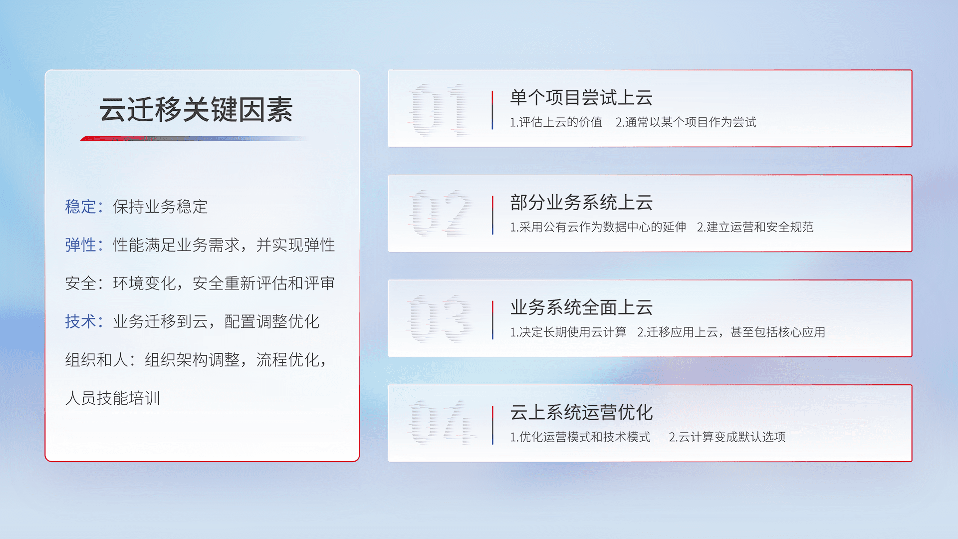 结合实际业务,,,从规划设计、、、云平台选型、、、、云原生改造、、数据迁移、、、集成交付,,,迁移全过程为客户识别最佳上云路径,,,做好风险识别管理,,设计网络架构、、身份权限、、、安全审计合规、、操作审计、、、、日志审计、、、监控告警策略、、多站点容灾设计等,,,对云上基础设施进行整体规划,,,,提升IT治理水平,,,以满足弹性、、、高可用、、、、高性能的需求。。。。