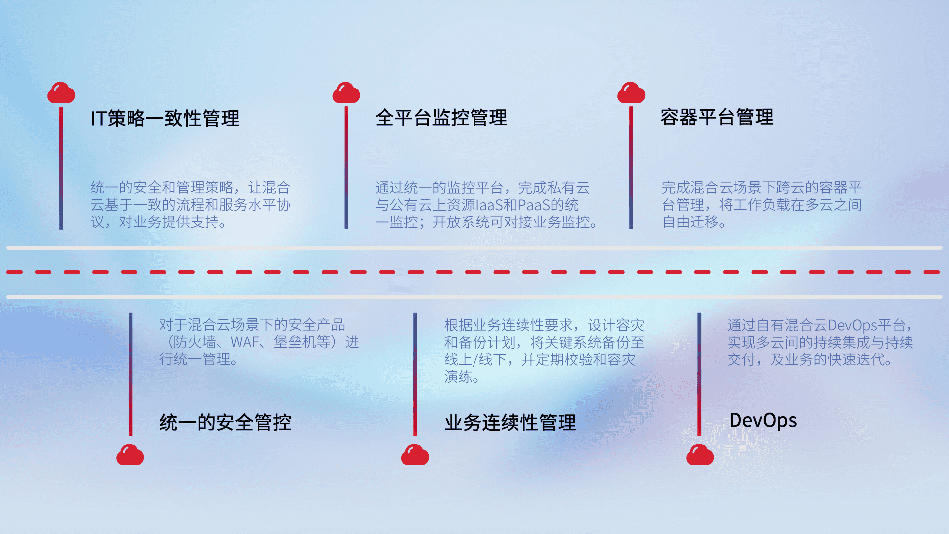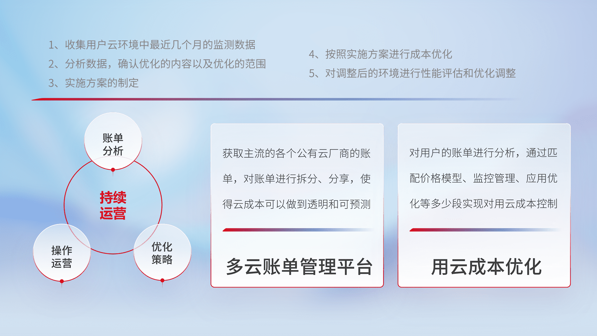 通过多云纳管,,以统一的资源数据模型把客户的云资源进行抽象和封装,,,,进而实现对多云资源的统一操作,,,,保障云资源管理的可靠性、、、、稳定性与可用性。。。。量身定制化运维内容,,配置、、、开发运维、、、补丁管理、、备份、、、、监控、、、、认证和访问管理、、、、审计和日常巡检等,,,保障在用云过程中的可靠度,,稳定度以及高可用率。。