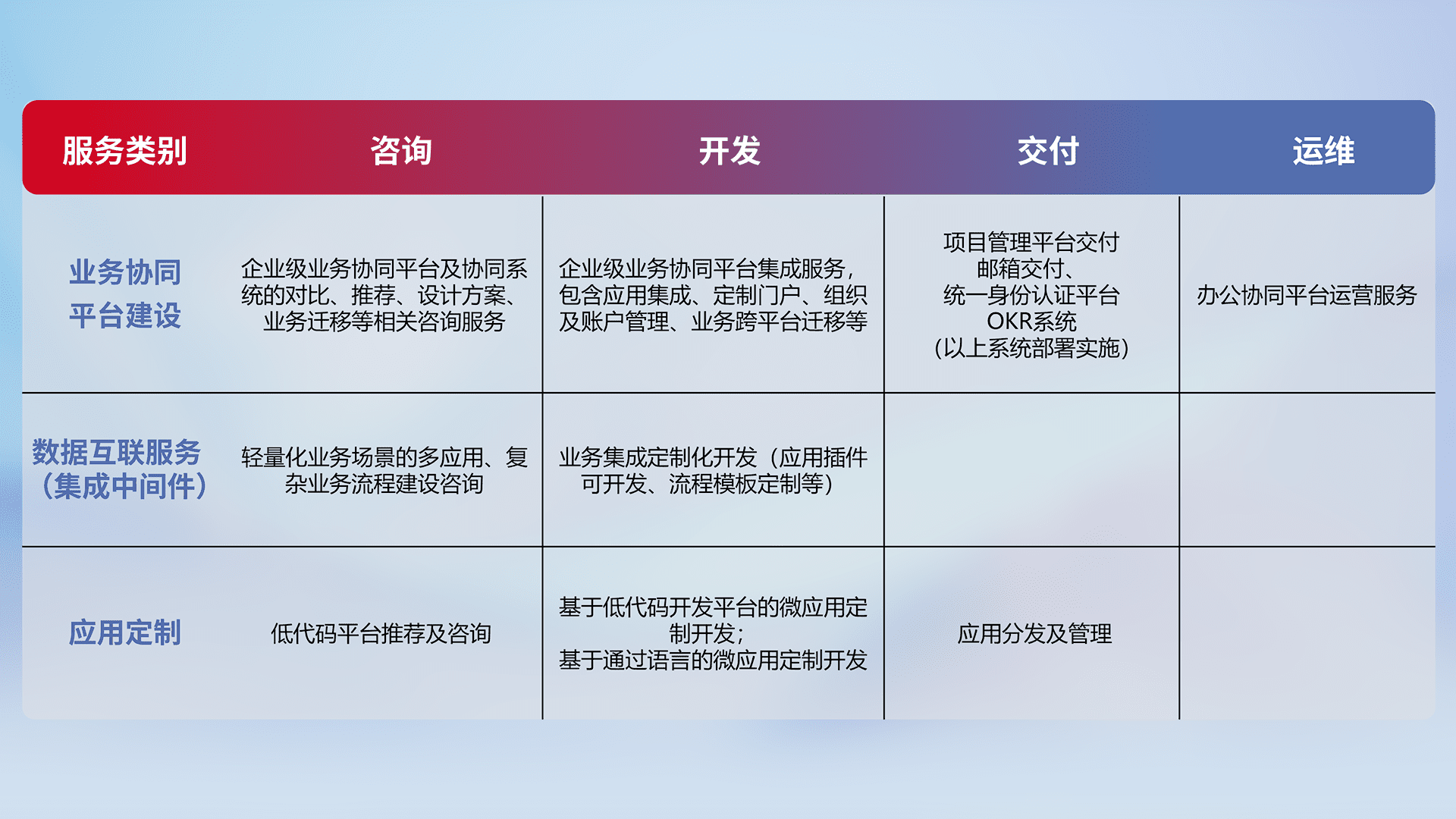 针对钉钉、、企微、、、、IDaas等平台级产品提供产品的规划、、、、方案、、交付、、、定制化开发等服务,,,实现如统一协同办公、、、智能客户服务、、混合会议管理、、、智能数据查询、、等业务场景,,实现数字化转型。。。。